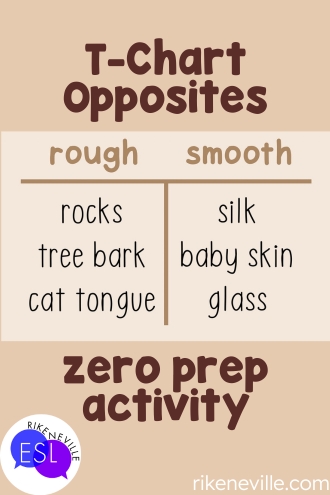 This one requires zero prep. Students draw a T-chart in their notebooks. Give them an opposite pair to write at the top – maybe “expensive/cheap” or “crowded/empty.”