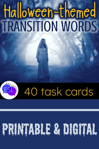 My set of 40 Halloween transition word task cards↗ gives students sentences with gaps. They choose the right transition from the options. There’s a full-color version, a printer-friendly black and white version, and a self-checking digital version.
