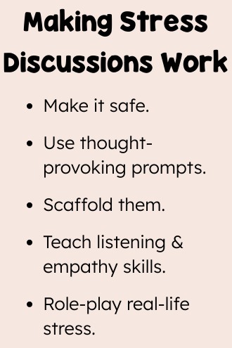 Scaffold discussions with sentence starters or guided questions. Some students feel more comfortable participating when you give them a framework to start from. Offer prompts or sentence frames that help initiate conversations about stress.